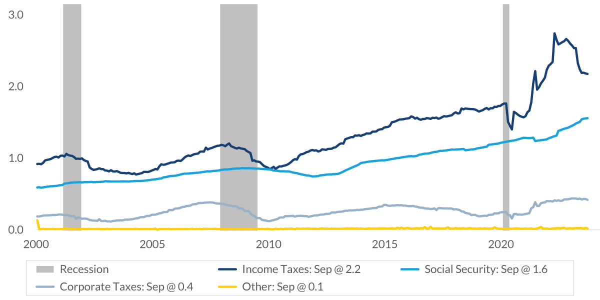 The lines show the 12-month rolling totals for the four major categories of tax receipts. At the top in navy blue is income tax revenue. You can see that this category peaked last year and has been on somewhat of a decline since then. There are several reasons for this decline. For one thing, tax receipts have not been as strong lately as in the past, mainly due to losses in the stock market last year (which reduced big, taxable capital gains). In addition, there have been delayed tax filings from a number of states due to natural disasters, with California (which is also the largest supplier of federal tax revenue) being the most prominent.