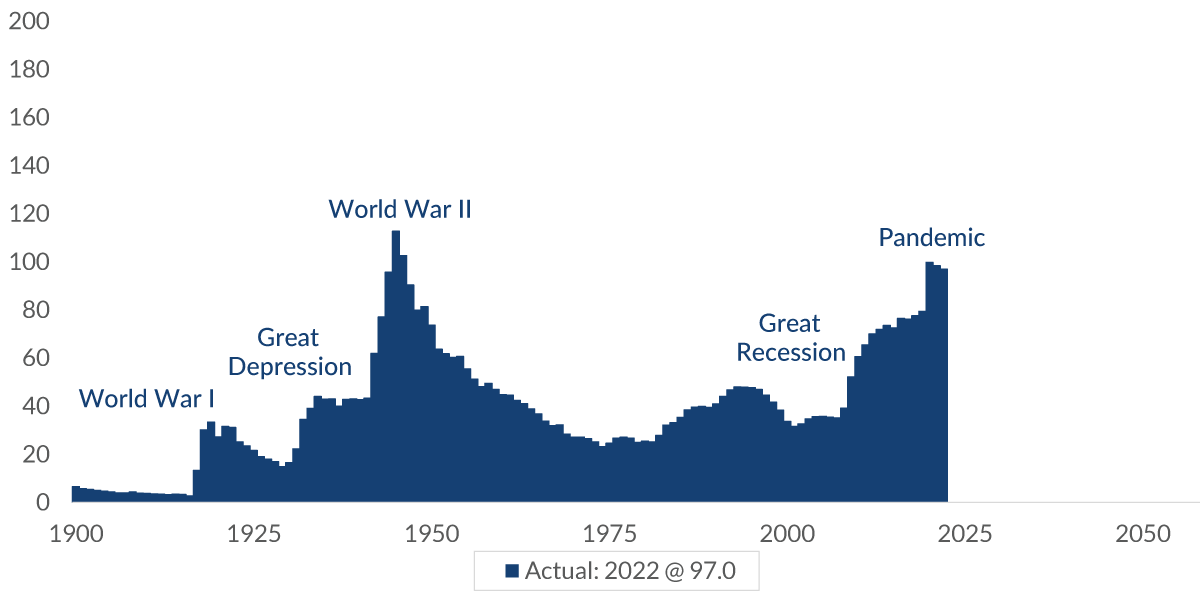 Chart 6: 5:59 – The debt, which is measured as a positive number in this chart, has shifted significantly over time. It tends to increase during wars and economic downturns, and it currently stands at 97% of GDP — the highest level we've seen since the end of World War II, when it was at 112%.